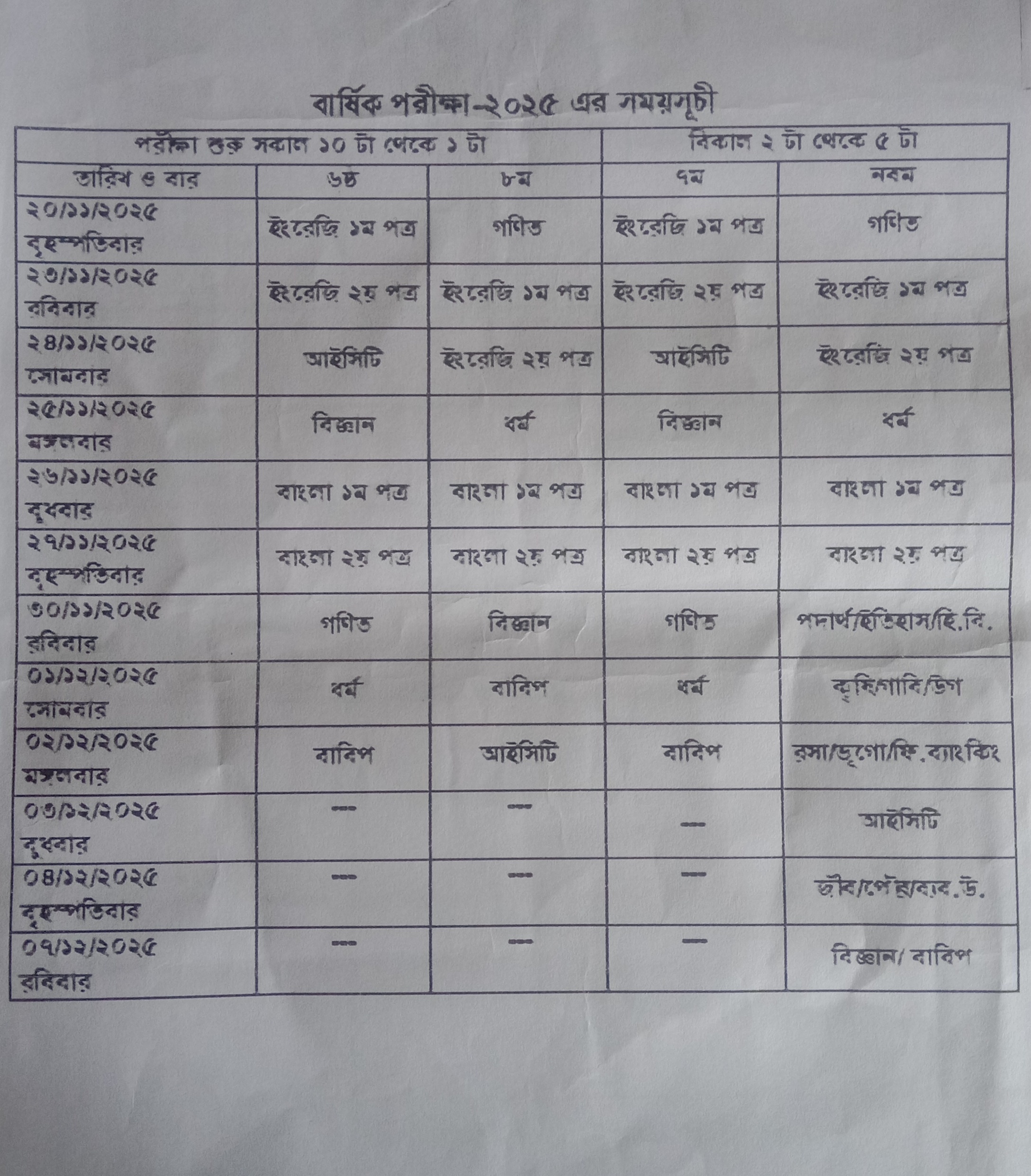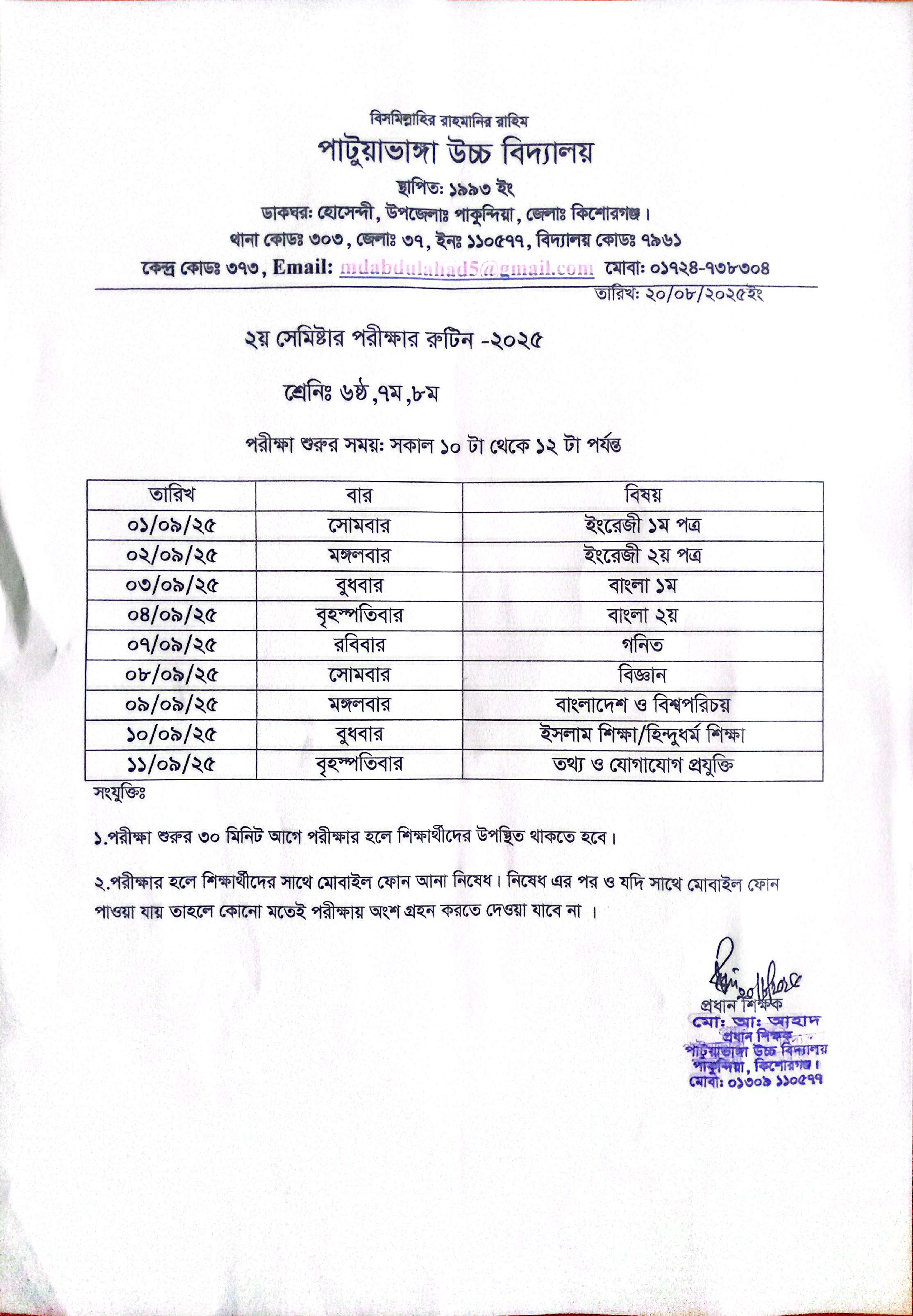 ০৫-১১-২০২৫ পাটুয়াভাঙ্গা উচ্চ বিদ্যালয়, পাকুন্দিয়া, কিশোরগঞ্জ। নির্বাচনী/বার্ষিক পরীক্ষা - ২০২৫ খ্রি. সময়সূচী: